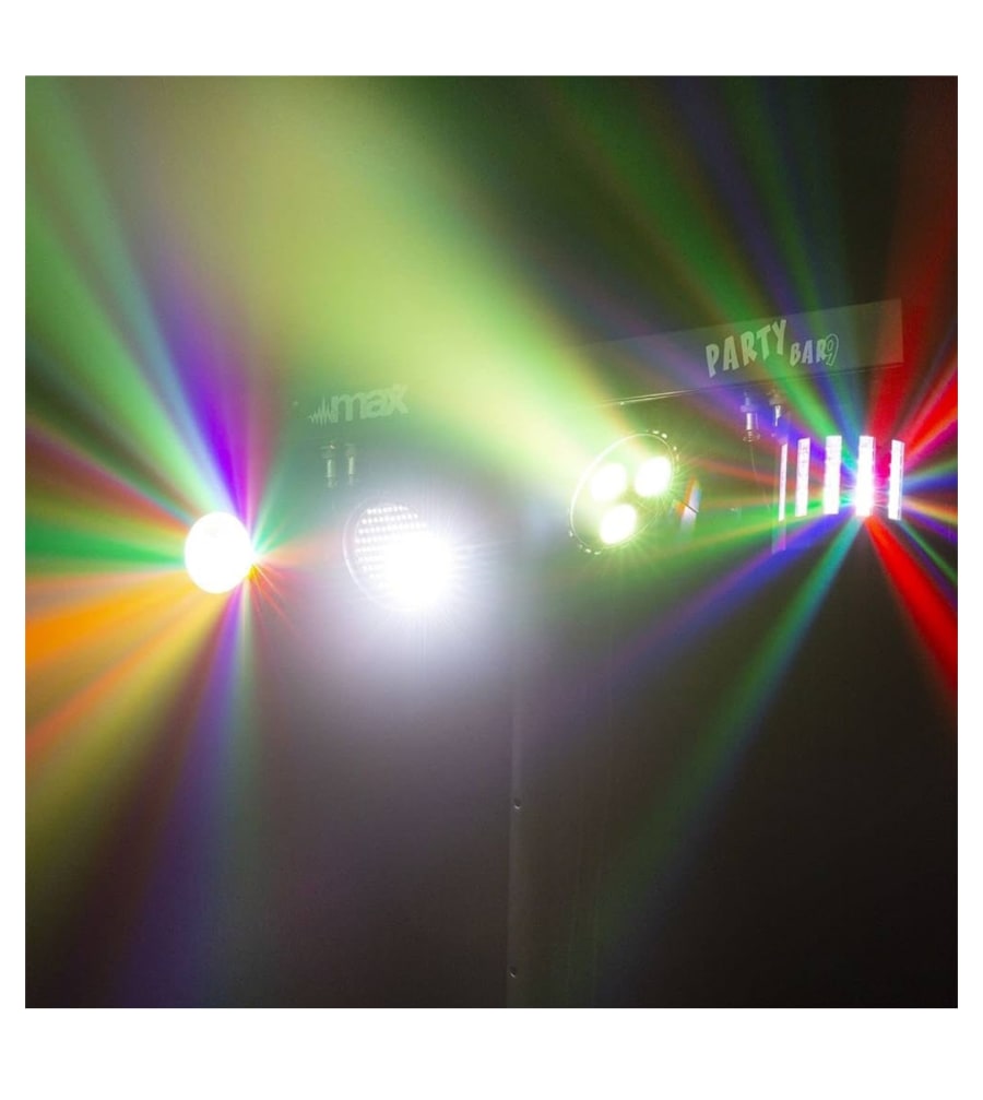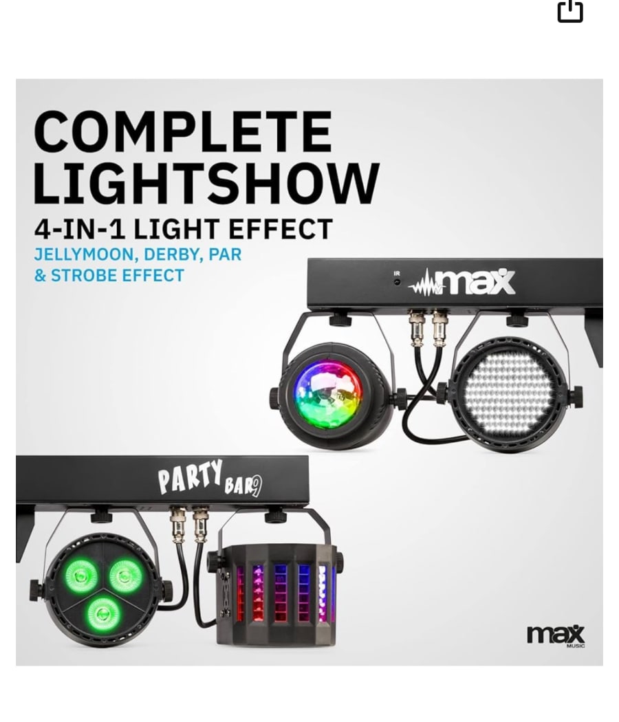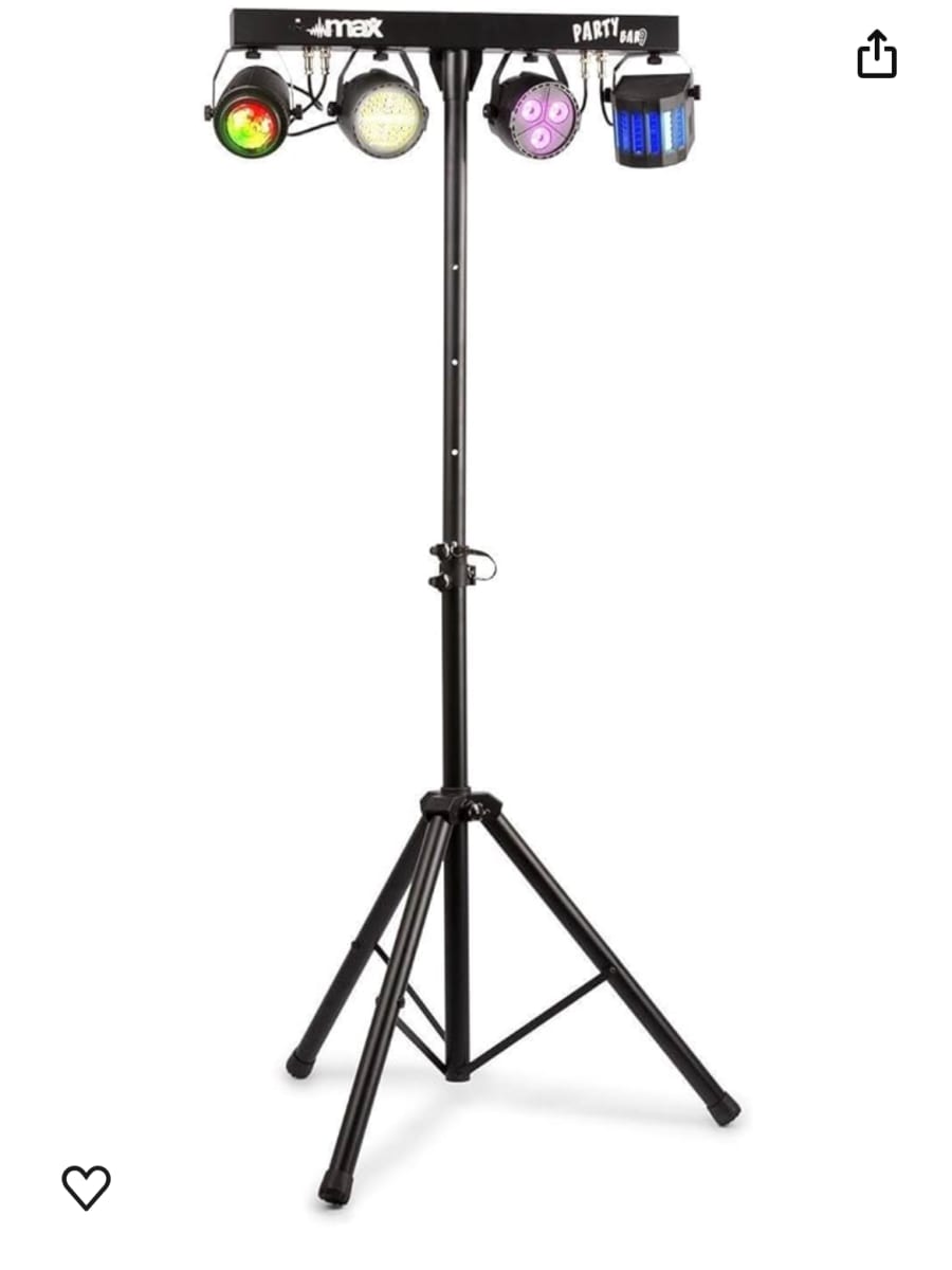 Features 1x par light, 1x jelly moon light, 1x derby and 1x strobe light, also includes adjustable stand.